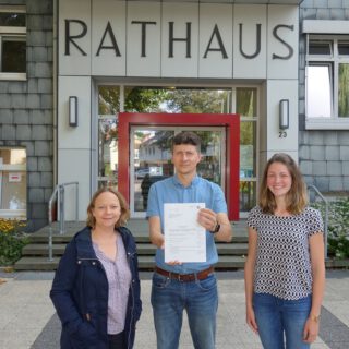 GWS Werl erhält den Förderbescheid: (von links) Nicole Pudwell (Stadtmarketing), Adrian Gruschka (Geschäftsführer GWS), Lisa Zölzer (FH Südwestfalen, City Lab Südwestfalen)“, Foto: Tobias Gebhardt, GWS Werl